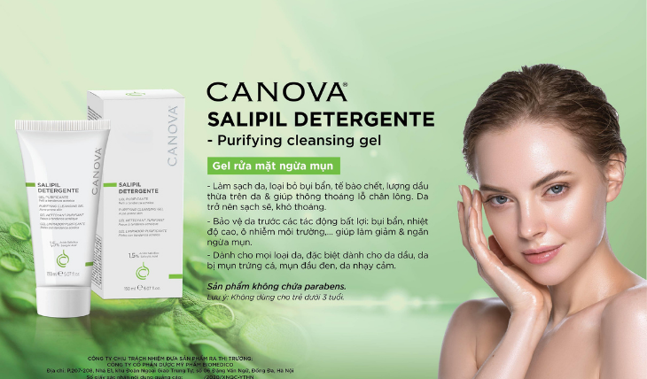 Gel rửa mặt ngừa mụn, thanh lọc da CANOVA SALIPIL DETERGENTE đáp ứng đầy đủ các tiêu chí trên. BHA 1.5% và tinh dầu tràm trà có trong sản phẩm giúp da được làm sạch sâu nhẹ dịu. Kết cấu dạng gel giúp sản phẩm không gây khô da sau khi sử dụng. Hoạt chất papain, hypericum giúp kháng khuẩn, chống viêm, giúp chữa trị làn da mụn hiệu quả.