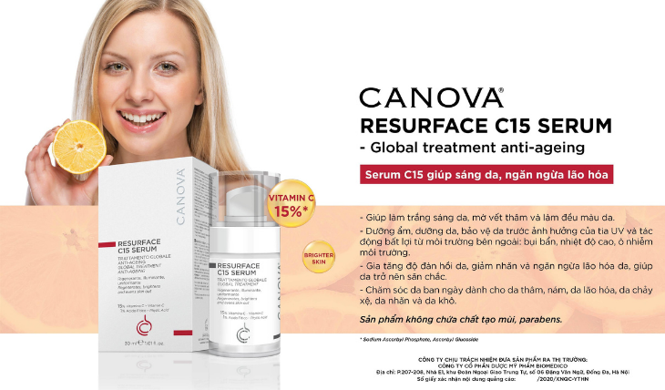 Cách khắc phục tình trạng này là bạn sử dụng Huyết thanh làm sáng da, ngăn ngừa lão hóa CANOVA RE-SURFACE C15 có chứa 15% vitamin C ổn định - chất chống các tác nhân gây hại từ môi trường hiệu quả. Đồng thời, làn da của bạn sẽ luôn được cấp ẩm nhờ hoạt chất trehalose.