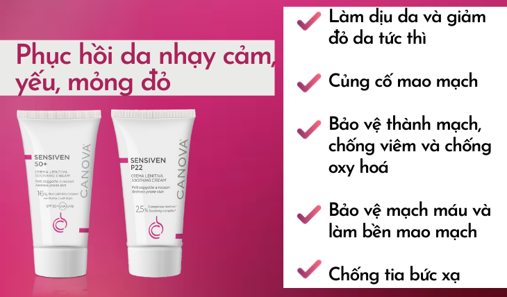 Bộ 2 sản phẩm kem dịu nhẹ, chống kích ứng, ngừa chứng đỏ da ngày và đêm CANOVA SENSIVEN 50+ và CANOVA SENSIVEN P22 là cặp đôi hoàn hảo dành cho bước phục hồi da nhạy cảm, mỏng, yếu.