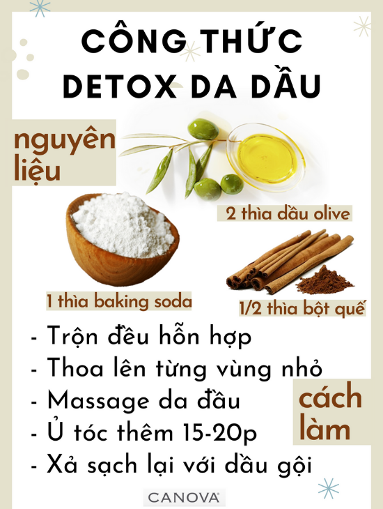 Thành phần baking soda và bột quế sẽ giúp detox da đầu, đánh bật các bụi bẩn, dầu nhờn và tế bào chết tích tụ mà dầu gội đầu không thể nào làm sạch hết được. Ngoài ra, dầu olive/ dầu dừa sẽ giúp nuôi dưỡng phần chân tóc chắc, khỏe và bóng mượt hơn.