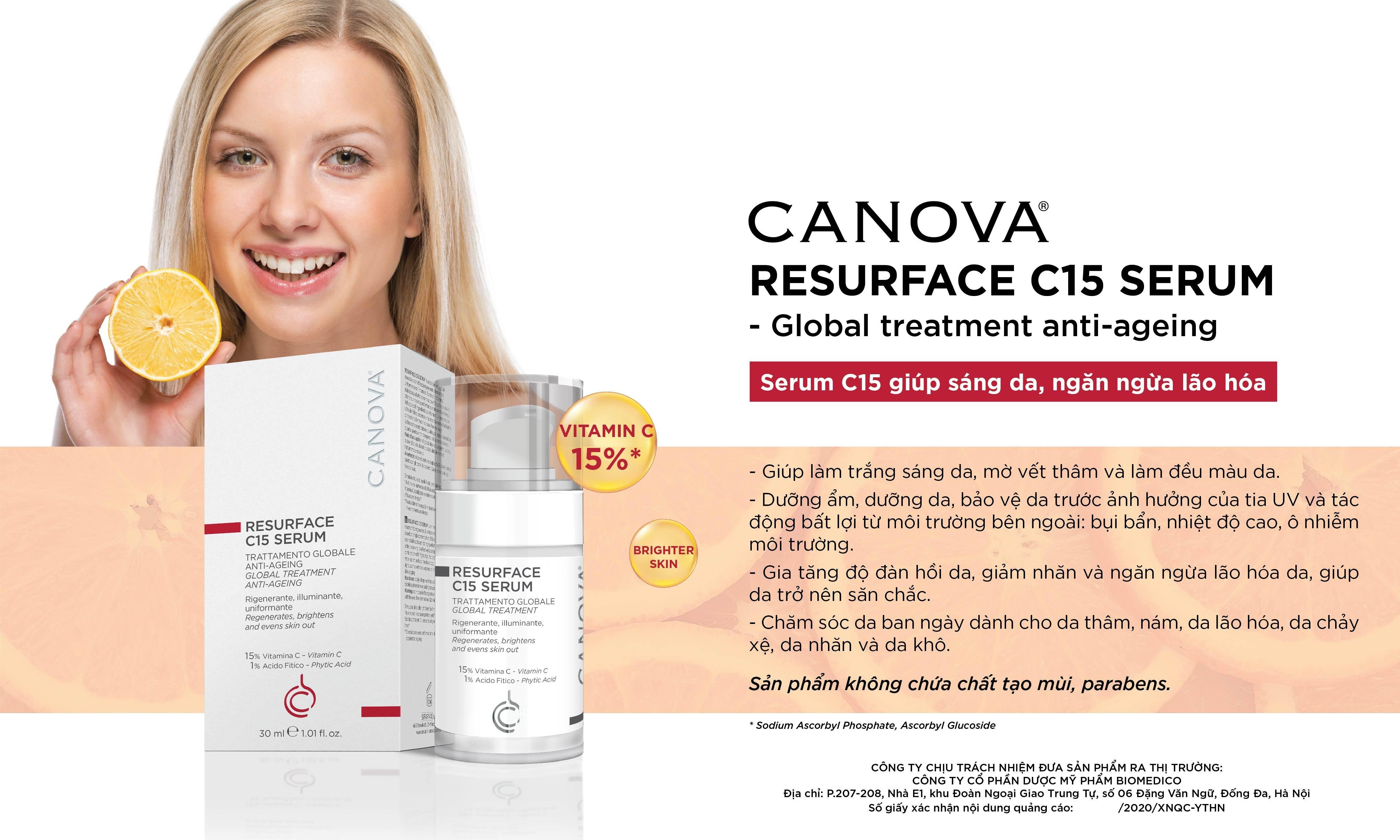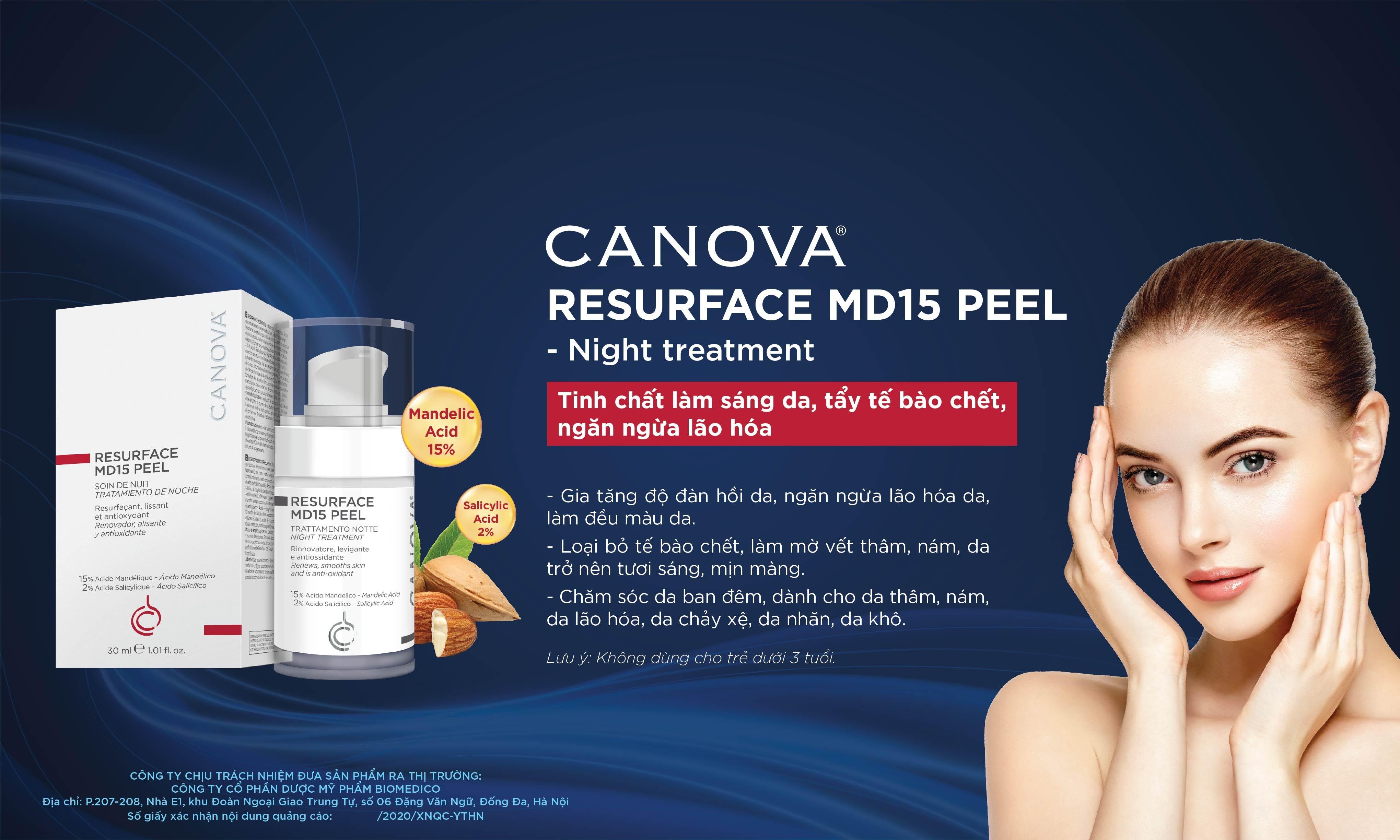 Bộ sản phẩm làm trắng da, chống lão hoá da CANOVA gồm huyết thanh CANOVA RE-SURFACE C15 và tinh chất tái tạo da CANOVA RE-SURFACE MD15 PEEL không chứa paraben, hiệu quả tức thì.
