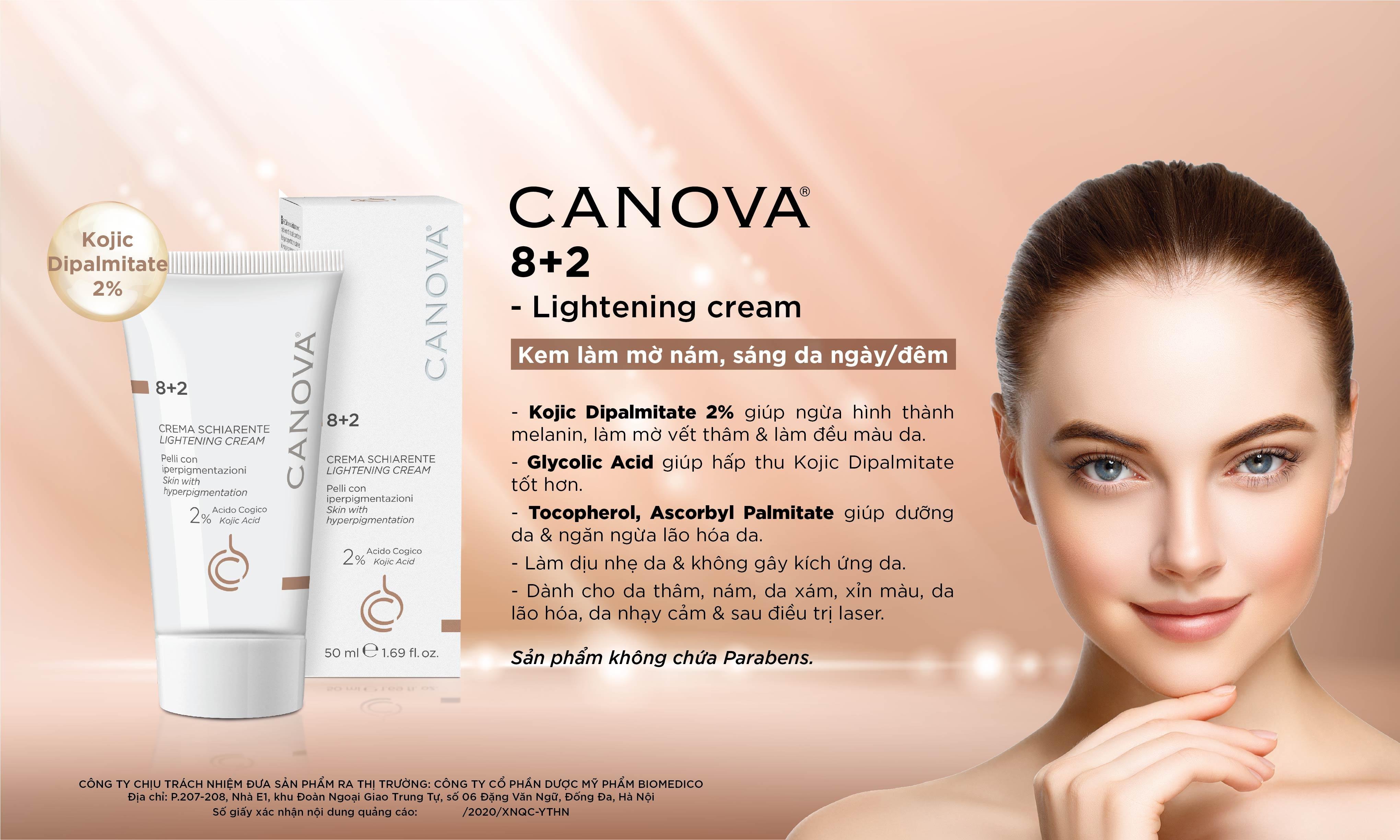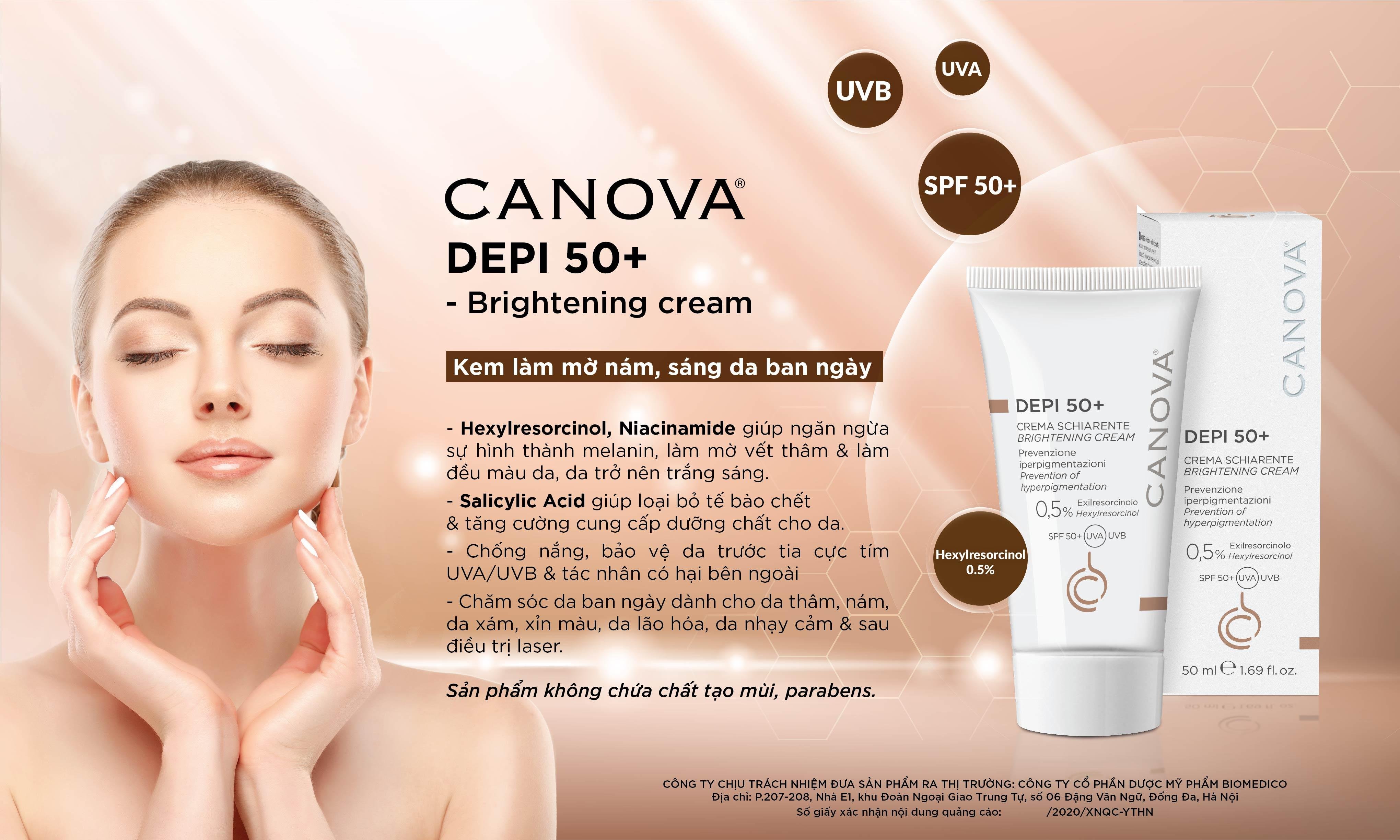 BỘ SẢN PHẨM TRỊ NÁM, LÀM SÁNG DA CANOVA® gồm 2 sản phẩm: kem làm mờ nám, sáng da ban ngày CANOVA DEPI 50+ và kem làm mờ nám, sáng da ban đêm CANOVA 8+2 là “cặp đôi” hoàn hảo giải quyết các nguyên nhân chính gây ra nám, tàn nhang.