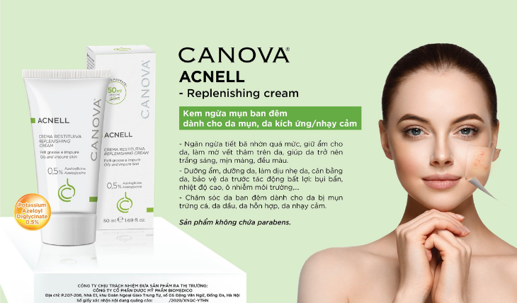 Kem ngừa mụn ban đêm CANOVA ACNELL chứa azeloglycine 0.5% (dẫn xuất của acid azelaic) giúp giảm tiết bã nhờn, chống lại vi khuẩn P.acnes, chống viêm, dưỡng ẩm và làm sáng da. Phức hợp thảo dược bao gồm tinh nghệ đen, chiết xuất manuka… giúp tái tạo da, giảm sừng, kiểm soát vi khuẩn. Khi sử dụng sản phẩm sẽ không bị khô da, mẩn đỏ nhờ có hoạt chất hyaluronic acid (HA) và betaine giữ ẩm, hoạt chất capryloyl glycine giúp làm dịu da.