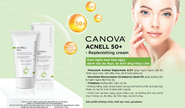 Tương tự như kem ngừa mụn ban đêm, kem ngừa mụn ban ngày CANOVA ACNELL 50+ chứa hoạt chất azeloglycine 0.5% giảm tiết bã nhờn, chống lại vi khuẩn P.acnes, chống viêm, làm trắng da. Tinh dầu nam việt quất dưỡng ẩm cho da trong quá trình điều trị. Hoạt chất trehalose bổ sung hàng rào bảo vệ da. Hoạt chất allantoin làm dịu da tức thì và làm ẩm da. Sản phẩm tích hợp hệ thống lọc giúp bảo vệ da khỏi tác động của tia UVA, UVB, ánh sáng xanh, hạn chế vết thâm sau mụn.