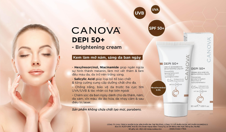 Với kem làm mờ nám, sáng da ban ngày CANOVA DEPI 50+, việc hình thành hắc sắc tố trên da được ức chế bởi các hoạt chất mạnh như hexylresorcinol 0.5%, niacinamide giúp làm trắng da, mờ thâm nám từ sâu bên trong. Đặc biệt, các hoạt chất này đều được chứng minh là an toàn, giảm kích ứng so với các hoạt chất trị nám khác. Hoạt chất BHA dạng vi nang làm sáng da, ngăn ngừa lão hóa, tẩy tế bào chết. Ngoài ra, CANOVA DEPI 50+ là sản phẩm tích hợp hệ thống lọc tia UVA, UVB, ánh sáng xanh từ điện thoại, máy tính… giúp chống oxy hóa da, giảm ảnh hưởng xấu của các tia bức xạ - một trong những “sát thủ” hàng đầu gây nám da.